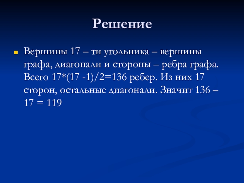 – ребра графа. Всего 17*(17 -1)/2=136 ребер. Из них 17 сторон, остальные диагонали. Значит 136 – 17 = 119