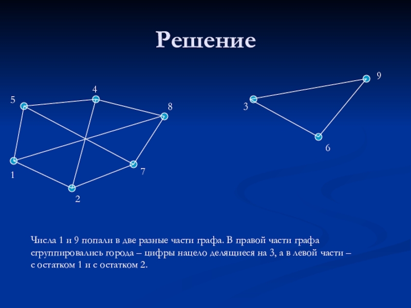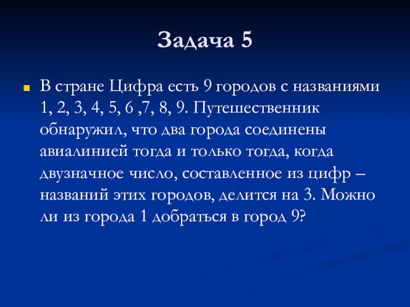 3, 4, 5, 6 ,7, 8, 9. Путешественник обнаружил, что два города соединены авиалинией тогда и только тогда, когда двузначное число, составленное из цифр – названий этих городов, делится на 3. Можно ли из города 1 добраться в город 9?