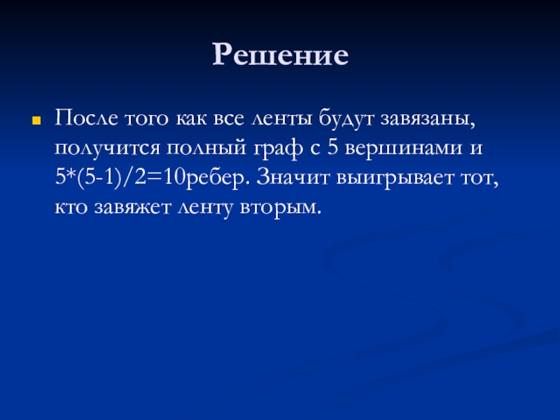 5 вершинами и 5*(5-1)/2=10ребер. Значит выигрывает тот, кто завяжет ленту вторым.
