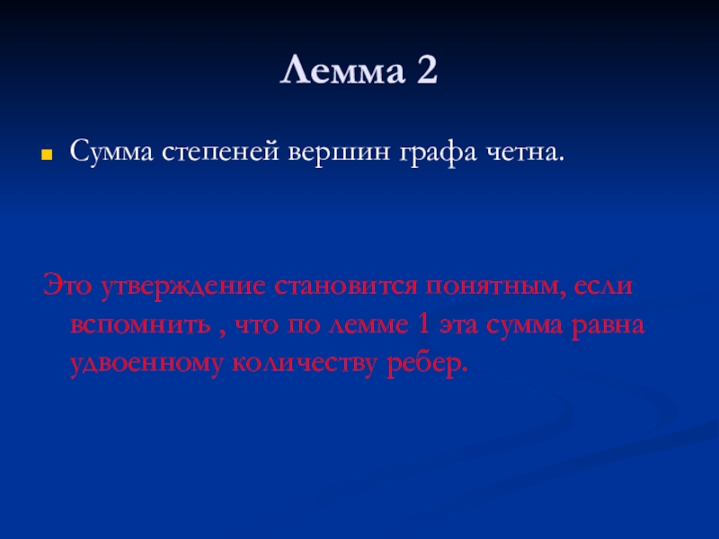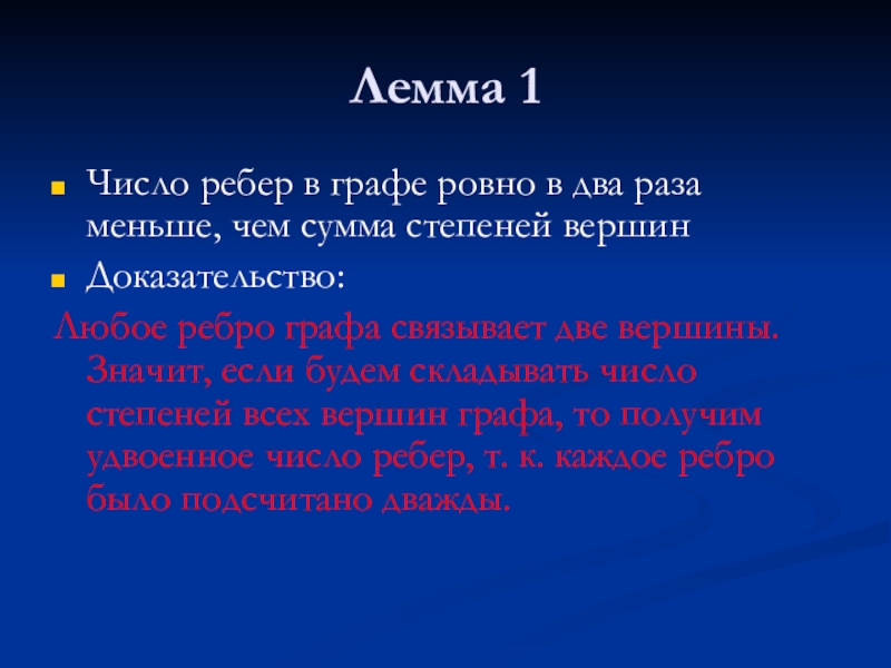 , что по лемме 1 эта сумма равна удвоенному количеству ребер.
