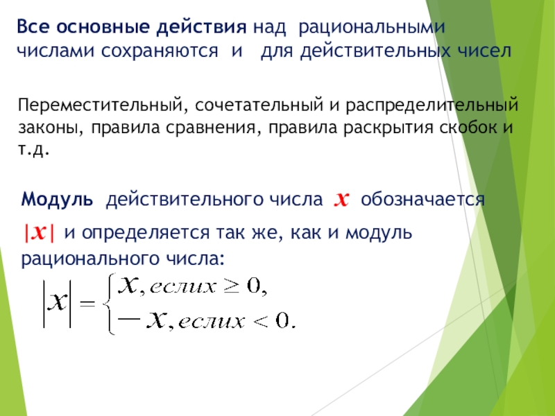 Модуль действительного числа х обозначается |х| и определяется так же, как и модуль рационального числа:
