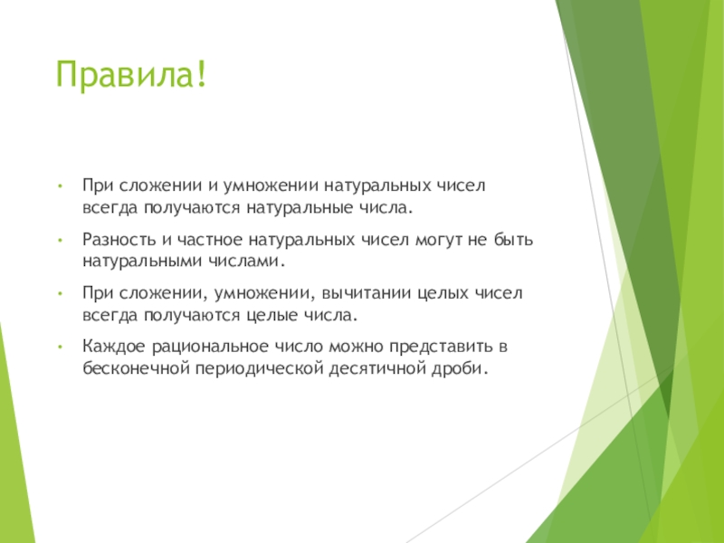 Переместительный, сочетательный и распределительный законы, правила сравнения, правила раскрытия скобок и т.д.