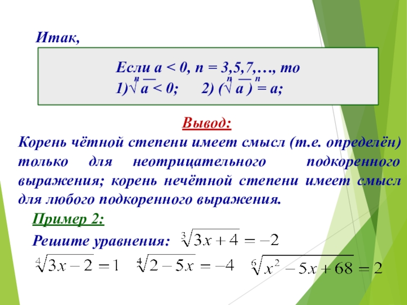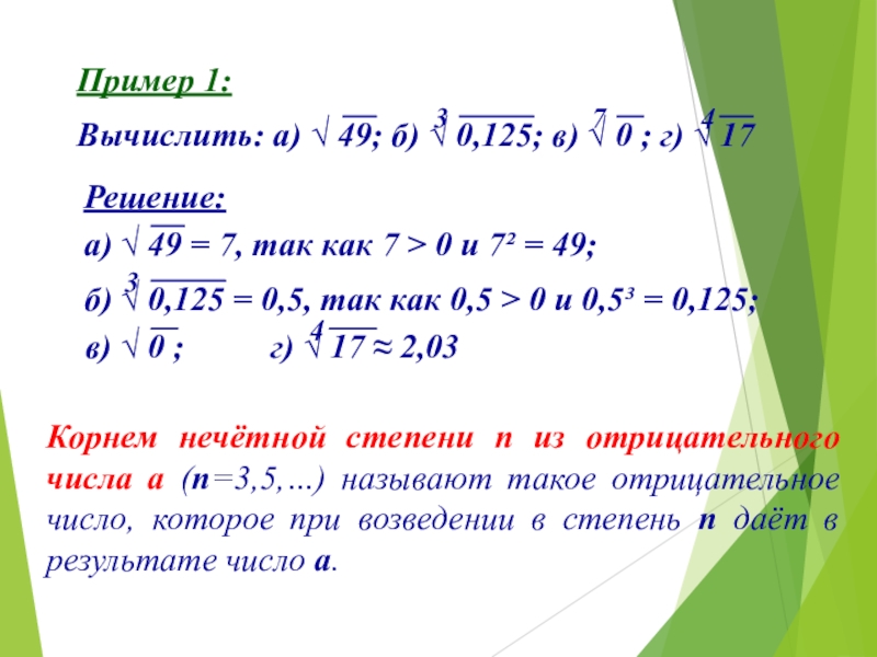 Корнем нечётной степени n из отрицательного числа a (n=3,5,…) называют такое отрицательное число, которое при возведении в степень n даёт в результате число a.
