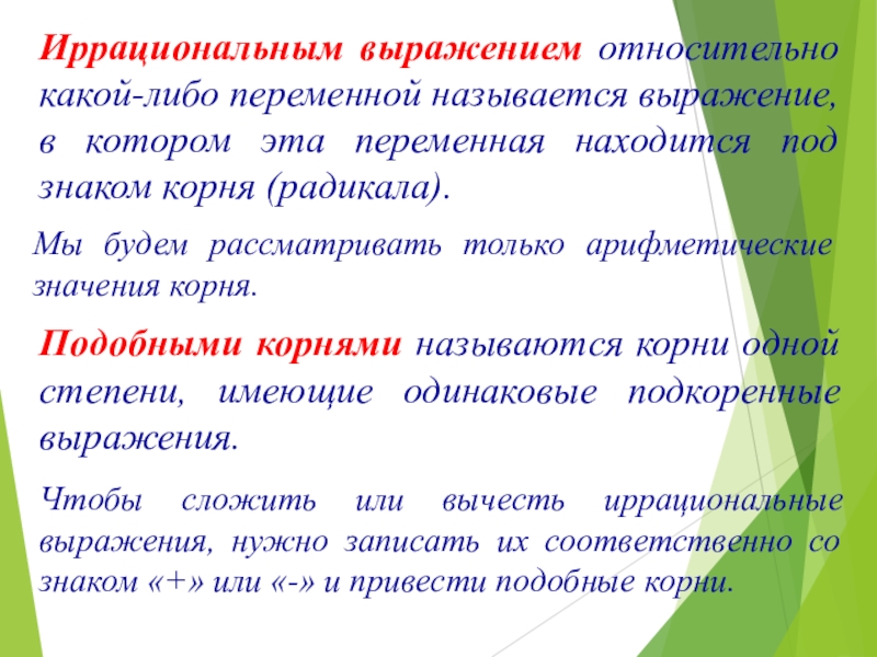Чтобы сложить или вычесть иррациональные выражения, нужно записать их соответственно со знаком «+» или «-» и привести подобные корни.