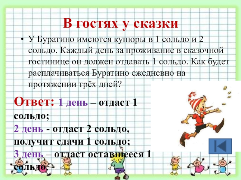 2 день - отдаст 2 сольдо, получит сдачи 1 сольдо;