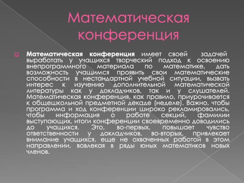 подход к освоению внепрограммного материала по математике, дать возможность учащимся проявить свои математические способности в нестандартной учебной ситуации, вызвать интерес к изучению дополнительной математической литературы как у докладчиков, так и у слушателей. Математическая конференция, как правило, приурочивается к общешкольной предметной декаде (неделе). Важно, чтобы программа и ход конференции широко рекламировались, чтобы информация о работе секций, фамилии выступающих, итоги конференции своевременно доводились до учащихся. Это, во-первых, повышает чувство ответственности у докладчиков, во-вторых, привлекает внимание учащихся, еще не охваченных работой в этом направлении, вовлекая в ряды юных математиков новых членов.