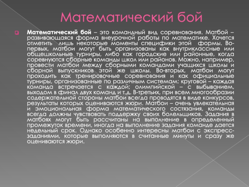 Математический бой – это командный вид соревнования. Матбой – развивающаяся