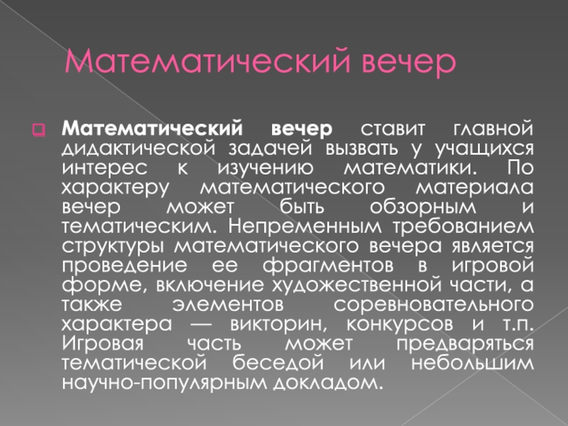 Математический вечер ставит главной дидактической задачей вызвать у учащихся интерес