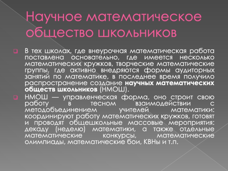 основательно, где имеется несколько математических кружков, творческие математические группы, где активно внедряются формы аудиторных занятий по математике, в последнее время получило распространение создание научных математических обществ школьников (НМОШ).