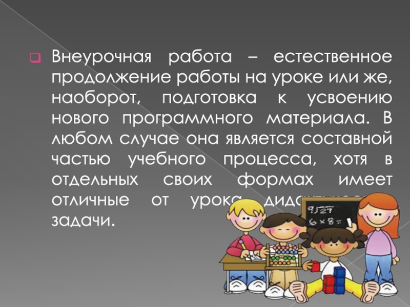 Слайд 4Внеурочная работа – естественное продолжение работы на уроке или же, наоборот,