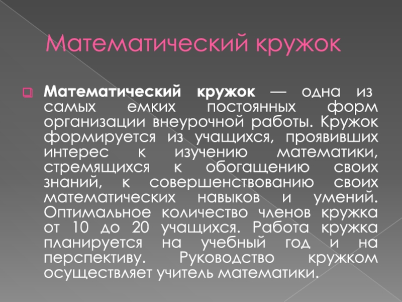 внеурочной работы. Кружок формируется из учащихся, проявивших интерес к изучению математики, стремящихся к обогащению своих знаний, к совершенствованию своих математических навыков и умений. Оптимальное количество членов кружка от 10 до 20 учащихся. Работа кружка планируется на учебный год и на перспективу. Руководство кружком осуществляет учитель математики.