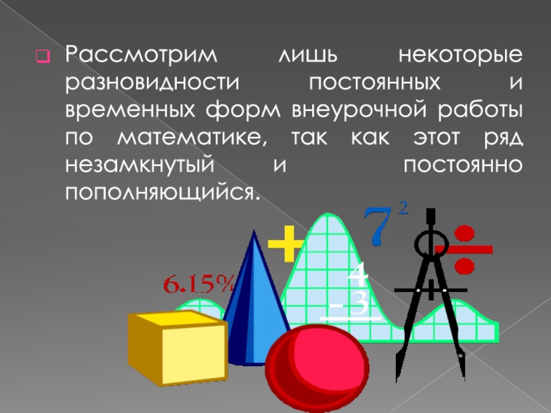 Слайд 6Рассмотрим лишь некоторые разновидности постоянных и временных форм внеурочной работы по