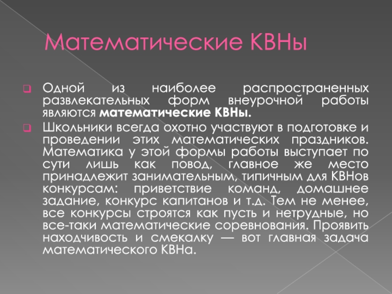 Школьники всегда охотно участвуют в подготовке и проведении этих математических праздников. Математика у этой формы работы выступает по сути лишь как повод, главное же место принадлежит занимательным, типичным для КВНов конкурсам: приветствие команд, домашнее задание, конкурс капитанов и т.д. Тем не менее, все конкурсы строятся как пусть и нетрудные, но все-таки математические соревнования. Проявить находчивость и смекалку — вот главная задача математического КВНа.