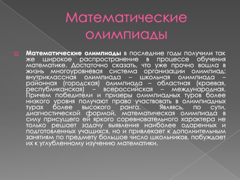 в процессе обучения математике. Достаточно сказать, что уже прочно вошла в жизнь многоуровневая система организации олимпиад: внутриклассная олимпиада – школьная олимпиада – районная (городская) олимпиада – областная (краевая, республиканская) – всероссийская – международная. Причем победители и призеры олимпиадных туров более низкого уровня получают право участвовать в олимпиадных турах более высокого ранга. Являясь, по сути, диагностической формой, математическая олимпиада в силу присущего ей яркого соревновательного характера не только решает задачу выявления наиболее одаренных и подготовленных учащихся, но и привлекает к дополнительным занятиям по предмету большое число школьников, побуждает их к углубленному изучению математики.