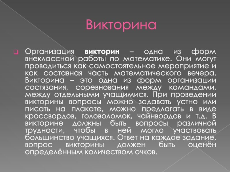 Они могут проводиться как самостоятельное мероприятие и как составная часть математического вечера. Викторина – это одна из форм организации состязания, соревнования между командами, между отдельными учащимися. При проведении викторины вопросы можно задавать устно или писать на плакате, можно предлагать в виде кроссвордов, головоломок, чайнвордов и т.д. В викторине должны быть вопросы различной трудности, чтобы в ней могло участвовать большинство учащихся. Ответ на каждое задание, вопрос викторины должен быть оценён определённым количеством очков.