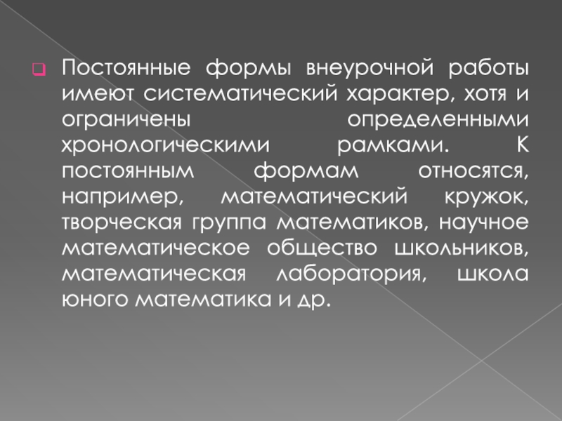 Слайд 5Постоянные формы внеурочной работы имеют систематический характер, хотя и ограничены определенными
