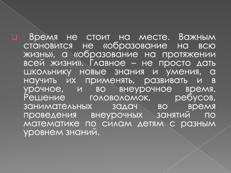 всю жизнь», а «образование на протяжении всей жизни». Главное – не просто дать школьнику новые знания и умения, а научить их применять, развивать и в урочное, и во внеурочное время. Решение головоломок, ребусов, занимательных задач во время проведения внеурочных занятий по математике по силам детям с разным уровнем знаний.