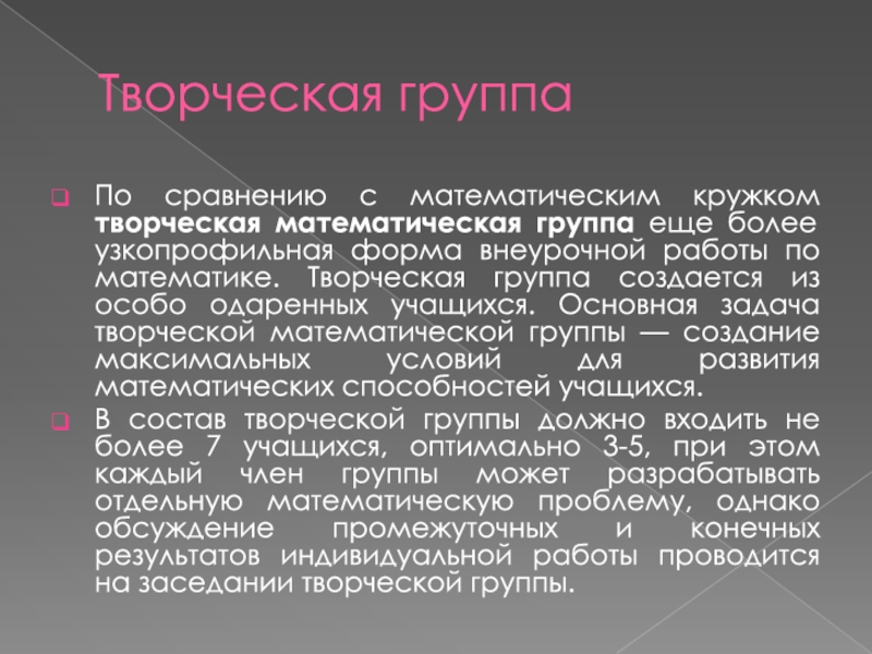 узкопрофильная форма внеурочной работы по математике. Творческая группа создается из особо одаренных учащихся. Основная задача творческой математической группы — создание максимальных условий для развития математических способностей учащихся.