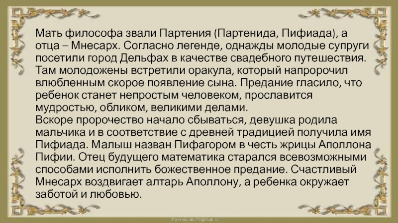 Слайд 3Мать философа звали Партения (Партенида, Пифиада), а отца – Мнесарх. Согласно