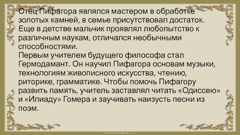 Слайд 4Отец Пифагора являлся мастером в обработке золотых камней, в семье присутствовал