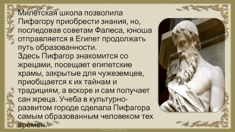 Слайд 7Милетская школа позволила Пифагору приобрести знания, но, последовав советам Фалеса, юноша