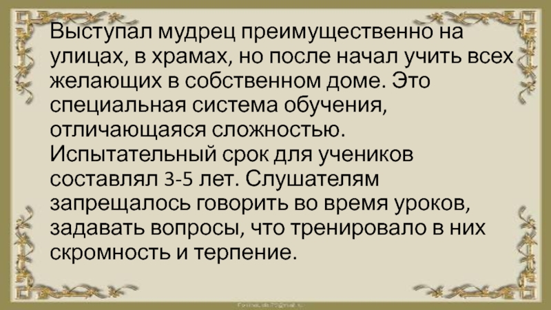 Слайд 10Выступал мудрец преимущественно на улицах, в храмах, но после начал учить