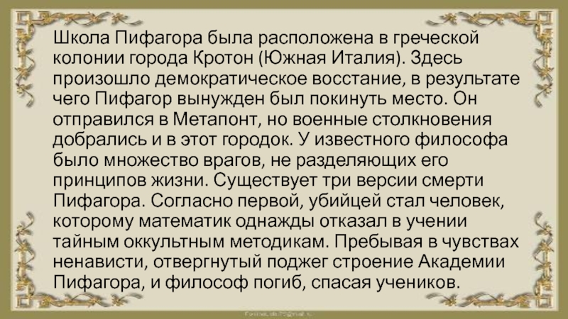 Здесь произошло демократическое восстание, в результате чего Пифагор вынужден был покинуть место. Он отправился в Метапонт, но военные столкновения добрались и в этот городок. У известного философа было множество врагов, не разделяющих его принципов жизни. Существует три версии смерти Пифагора. Согласно первой, убийцей стал человек, которому математик однажды отказал в учении тайным оккультным методикам. Пребывая в чувствах ненависти, отвергнутый поджег строение Академии Пифагора, и философ погиб, спасая учеников.