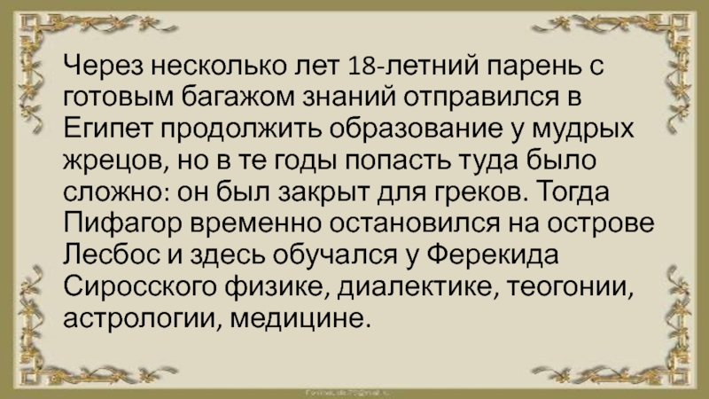 Египет продолжить образование у мудрых жрецов, но в те годы попасть туда было сложно: он был закрыт для греков. Тогда Пифагор временно остановился на острове Лесбос и здесь обучался у Ферекида Сиросского физике, диалектике, теогонии, астрологии, медицине.