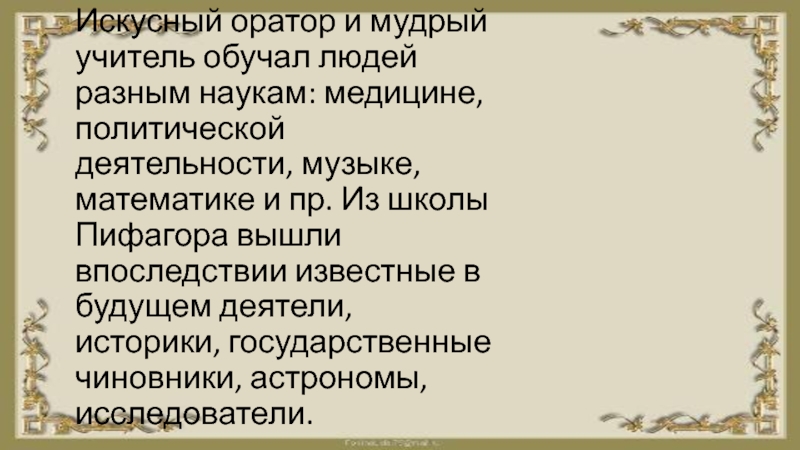 деятельности, музыке, математике и пр. Из школы Пифагора вышли впоследствии известные в будущем деятели, историки, государственные чиновники, астрономы, исследователи.