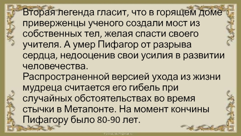 из собственных тел, желая спасти своего учителя. А умер Пифагор от разрыва сердца, недооценив свои усилия в развитии человечества.