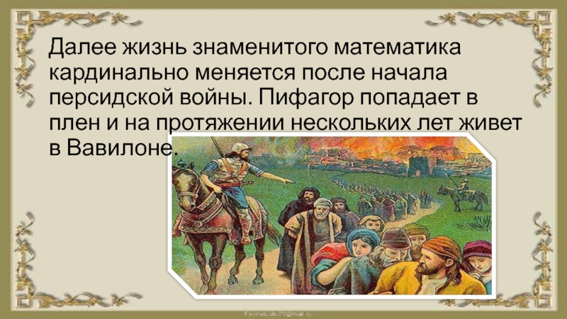 Слайд 8Далее жизнь знаменитого математика кардинально меняется после начала персидской войны. Пифагор