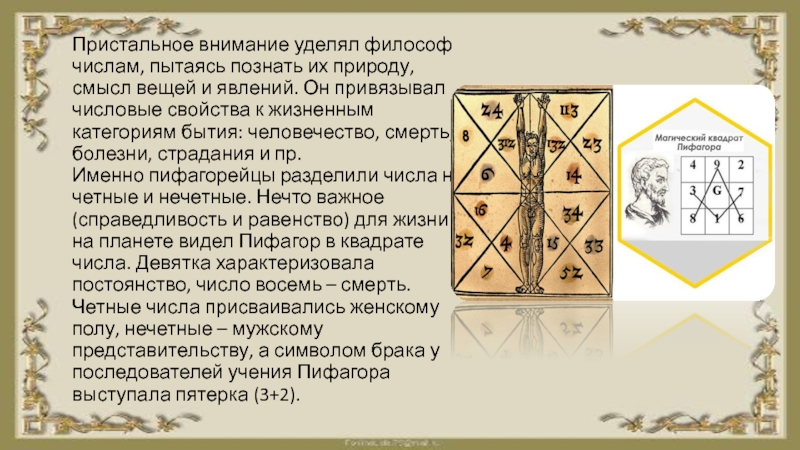 Слайд 13Пристальное внимание уделял философ числам, пытаясь познать их природу, смысл вещей
