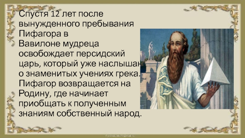 Слайд 9Спустя 12 лет после вынужденного пребывания Пифагора в Вавилоне мудреца освобождает персидский