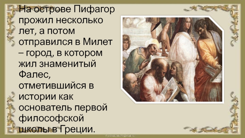 Слайд 6На острове Пифагор прожил несколько лет, а потом отправился в Милет