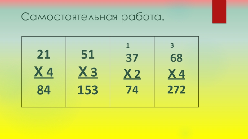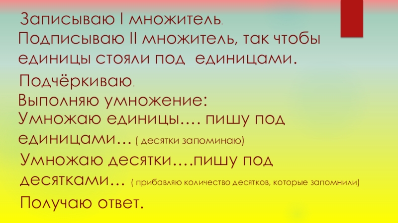 Умножаю десятки….пишу под десятками… ( прибавляю количество десятков, которые запомнили)