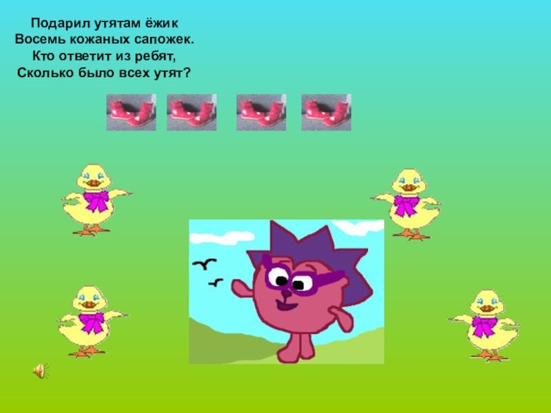 Подарил утятам ёжикВосемь кожаных сапожек.Кто ответит из ребят,Сколько было всех утят?