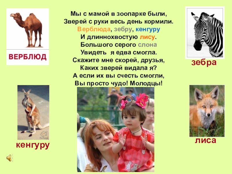 Мы с мамой в зоопарке были,Зверей с руки весь день кормили.Верблюда, зебру, кенгуруИ длиннохвостую лису.Большого серого слонаУвидеть я едва смогла.Скажите мне скорей, друзья,Каких зверей видала я?А если их вы счесть смогли,Вы просто чудо! Молодцы!