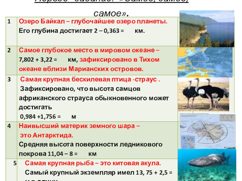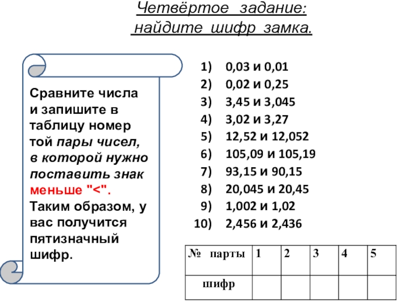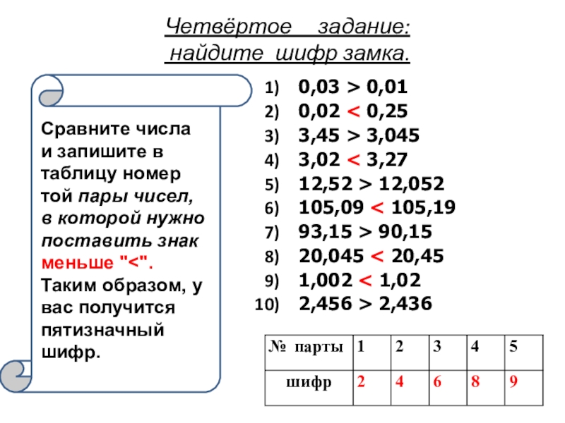 Сравните числа и запишите в таблицу номер той пары чисел, в которой нужно поставить знак меньше "<". Таким образом, у вас получится пятизначный шифр.