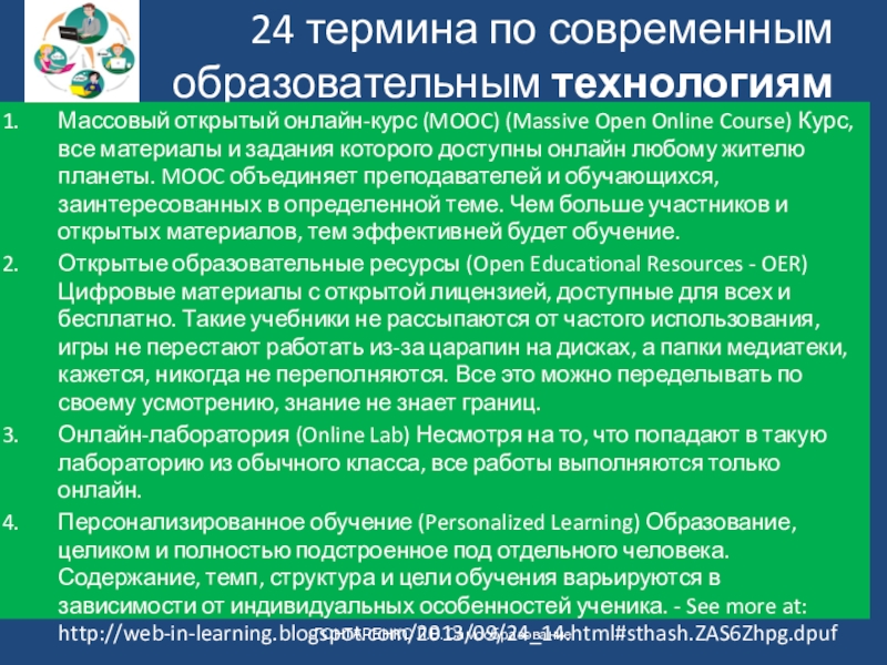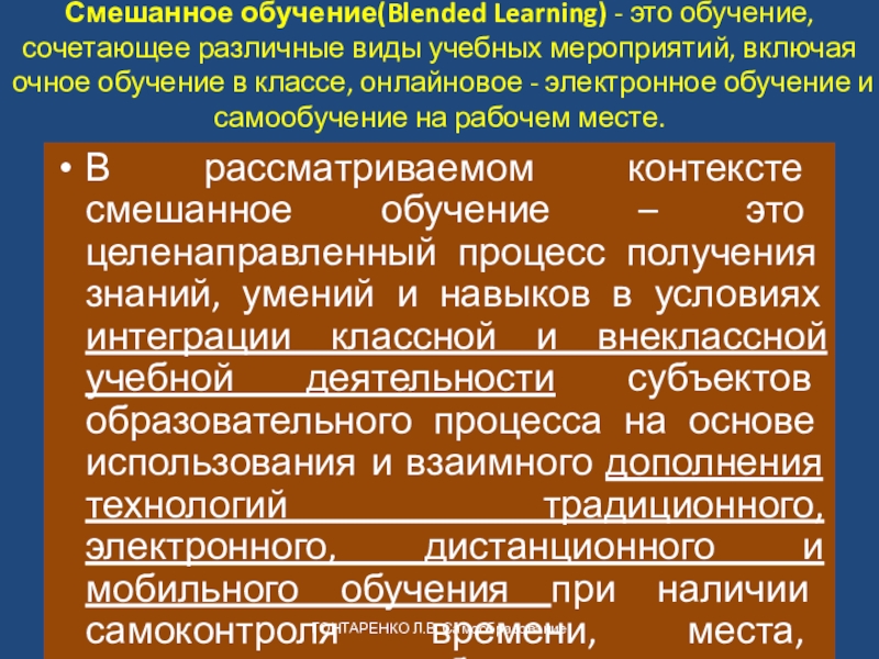 В рассматриваемом контексте смешанное обучение – это целенаправленный процесс получения знаний, умений и навыков в условиях интеграции классной и внеклассной учебной деятельности субъектов образовательного процесса на основе использования и взаимного дополнения технологий традиционного, электронного, дистанционного и мобильного обучения при наличии самоконтроля времени, места, маршрута и темпа обучения.