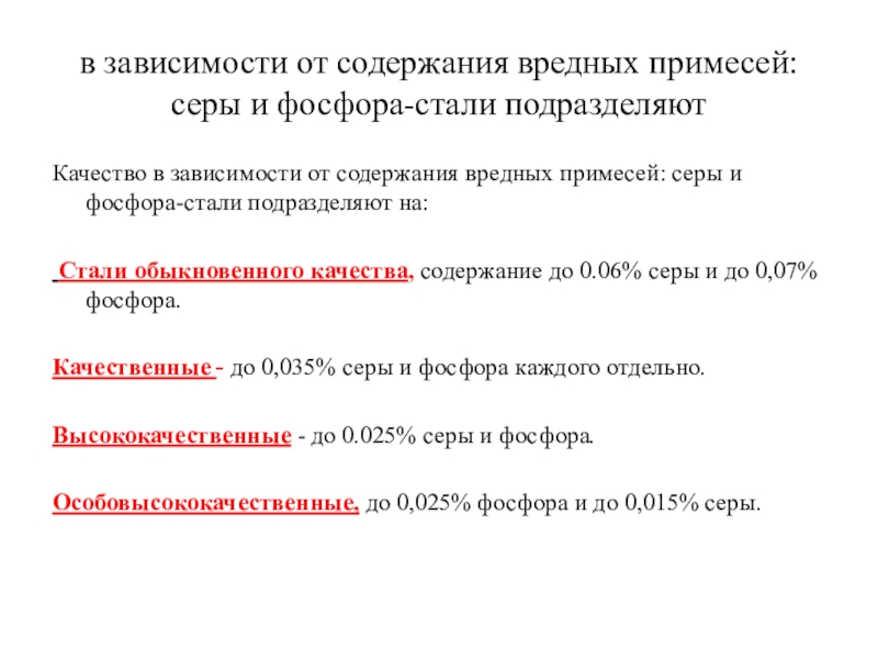 Слайд 4в зависимости от содержания вредных примесей: серы и фосфора-стали подразделяют