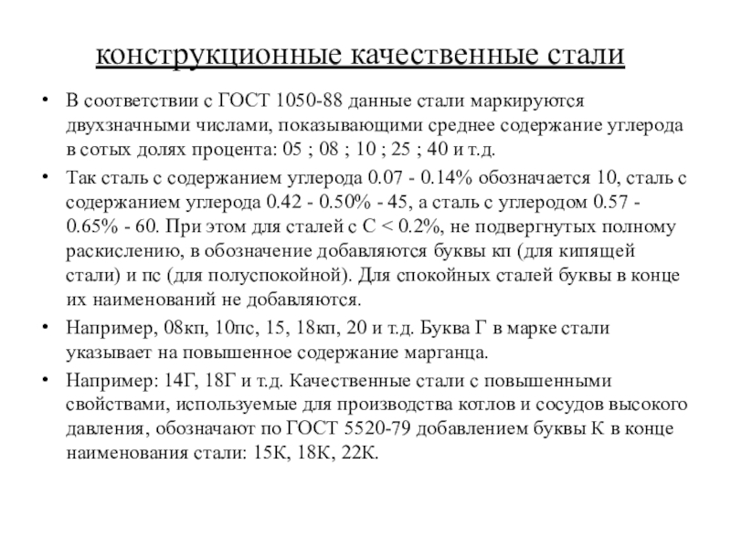 Так сталь с содержанием углерода 0.07 - 0.14% обозначается 10, сталь с содержанием углерода 0.42 - 0.50% - 45, а сталь с углеродом 0.57 - 0.65% - 60. При этом для сталей с C < 0.2%, не подвергнутых полному раскислению, в обозначение добавляются буквы кп (для кипящей стали) и пс (для полуспокойной). Для спокойных сталей буквы в конце их наименований не добавляются.