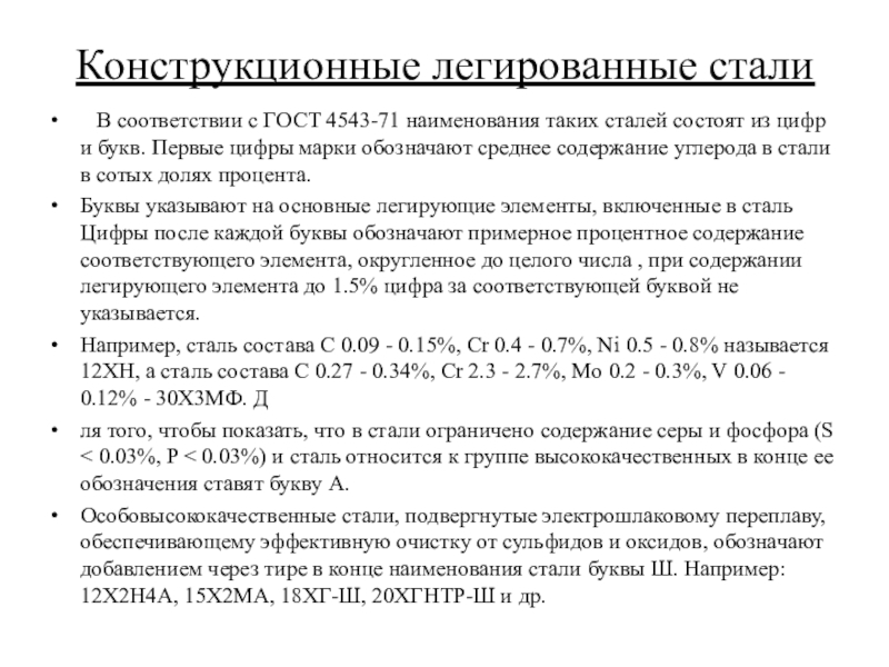 Буквы указывают на основные легирующие элементы, включенные в сталь Цифры после каждой буквы обозначают примерное процентное содержание соответствующего элемента, округленное до целого числа , при содержании легирующего элемента до 1.5% цифра за соответствующей буквой не указывается.