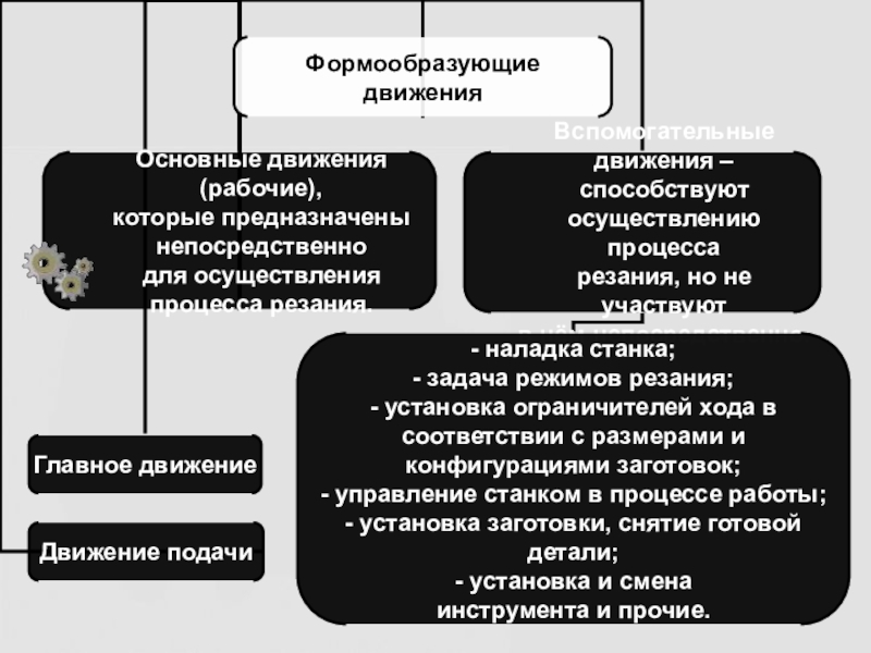 Формообразующие движения — движения, осуществляемые инструментом и заготовкой, необходимые для осуществления процесса резания, при изготовлении деталей со снятием припуска, на металлорежущих станках.