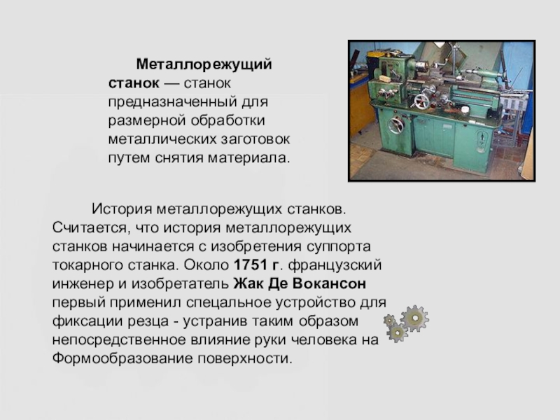 Считается, что история металлорежущих станков начинается с изобретения суппорта токарного станка. Около 1751 г. французский инженер и изобретатель Жак Де Вокансон первый применил спецальное устройство для фиксации резца - устранив таким образом непосредственное влияние руки человека на Формообразование поверхности.