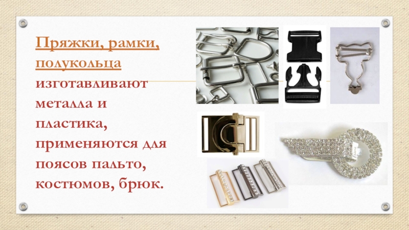 Слайд 10Пряжки, рамки, полукольца изготавливают металла и пластика, применяются для поясов пальто,