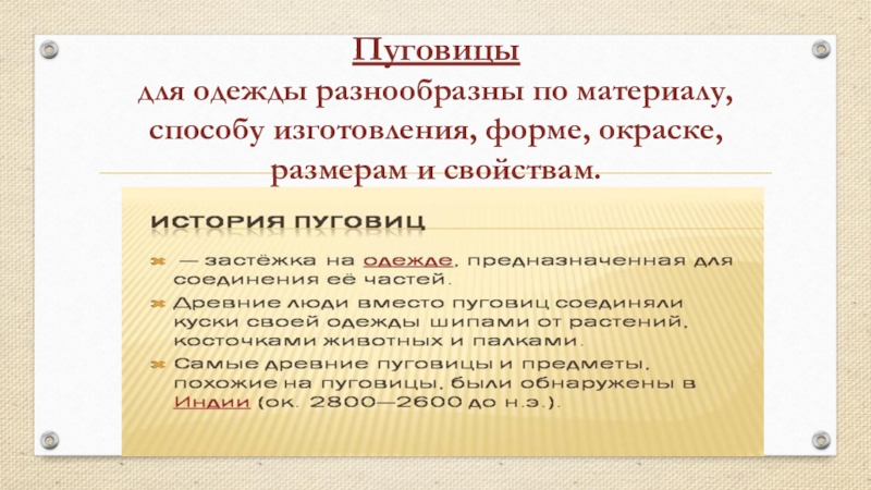Слайд 5Пуговицы для одежды разнообразны по материалу, способу изготовления, форме, окраске, размерам