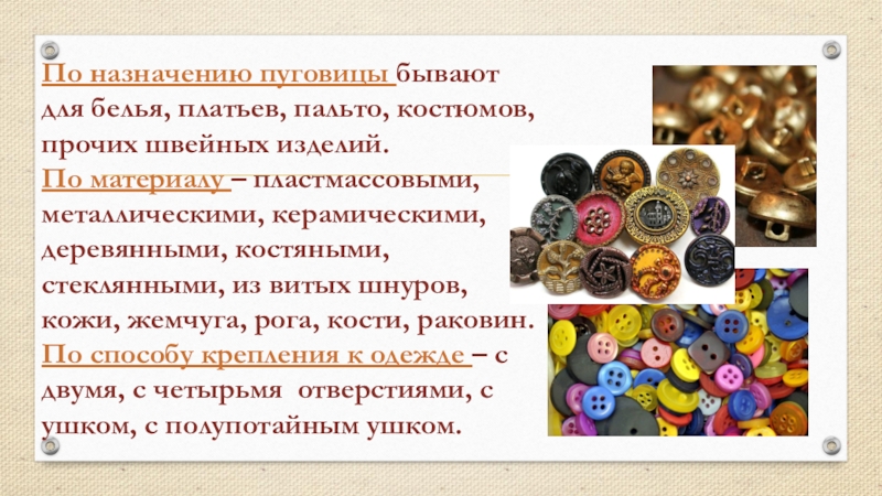 Слайд 6По назначению пуговицы бывают для белья, платьев, пальто, костюмов, прочих швейных