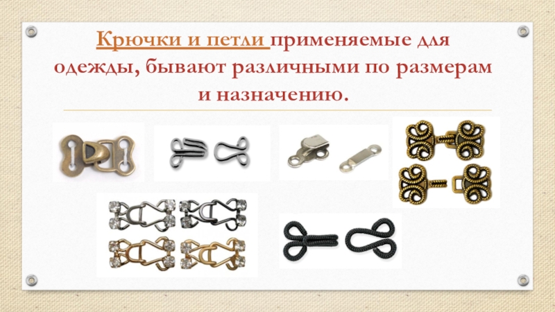 Слайд 7Крючки и петли применяемые для одежды, бывают различными по размерам и