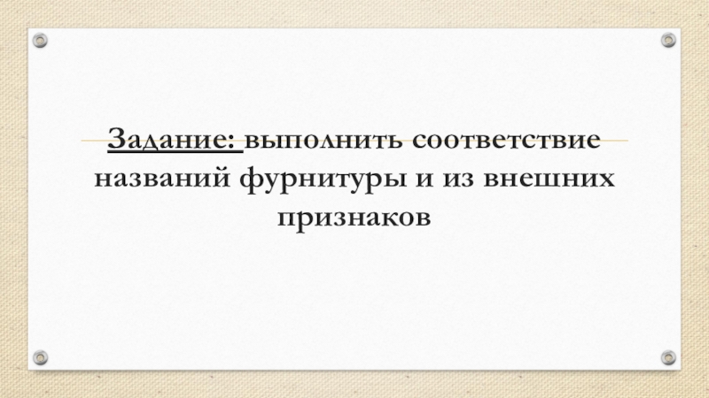Слайд 13Задание: выполнить соответствие названий фурнитуры и из внешних признаков