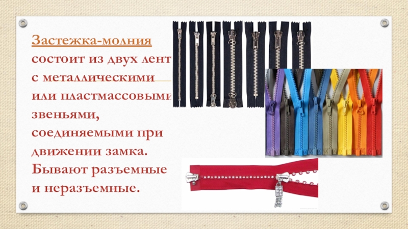 Слайд 11Застежка-молния состоит из двух лент с металлическими или пластмассовыми звеньями, соединяемыми